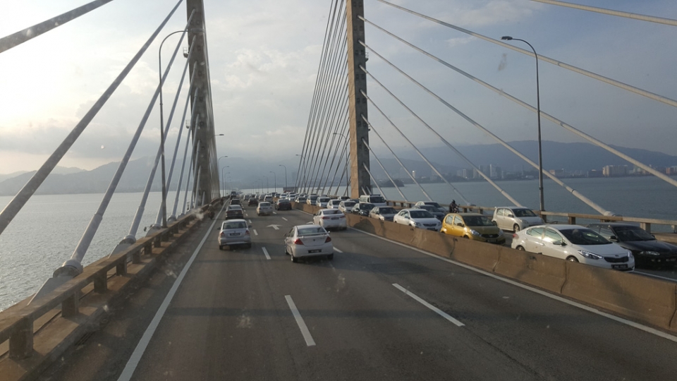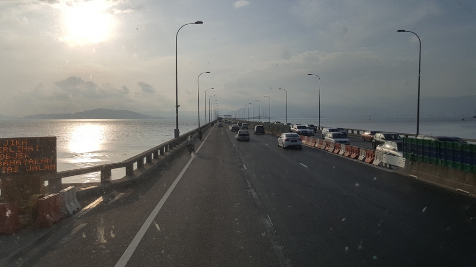 Der Bus blieb dann auch in Butterworth am Fährhafen stehen und gegenüber konnten wir Georgetown sehen. Einige Fahrgäste steigen aus. Weiter entfernt im Süden gibt es auch eine Brücke, die auf die Insel Penang führt. Keine Ahnung, welcher Weg für uns der bessere sein könnte, auf dem Ticket war nichts erkennbar und dem Busfahrer wars auch egal wie lange wir drin sitzen bleiben. Weil die Brücke so cool war (immerhin 13,5km lang und 6 spurig) beschlossen wir weiterzufahren.